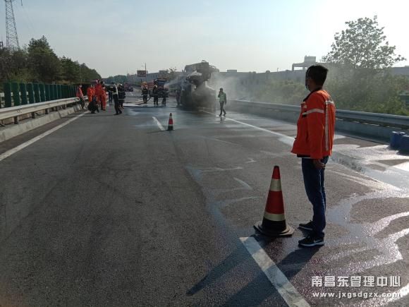 混凝土搅拌车高速起火 江西养护人员及时排险情